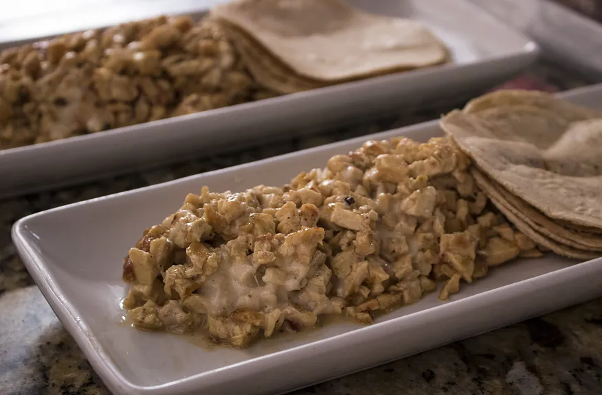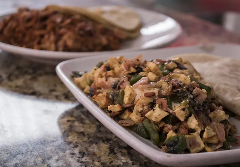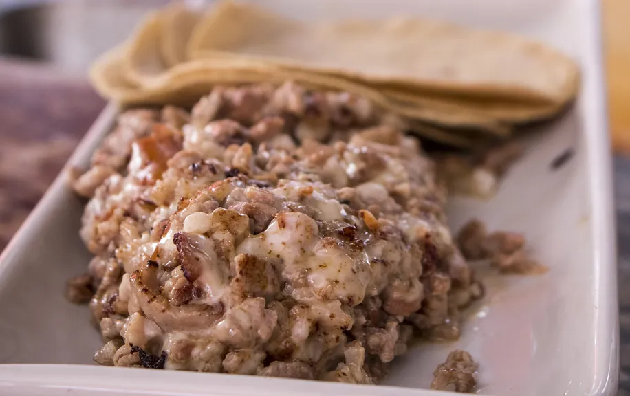 Champiñón quisado con queso manchego acompañado de tortillas de harina