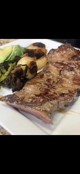 Arrachera a la parrilla, acompañada de nopales, cebolla cambray, aguacate y tortillas de harina y máiz