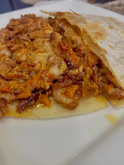 Una delicia, hecha con tortilla de harina, queso manchego, piña y pastor directito del trompo